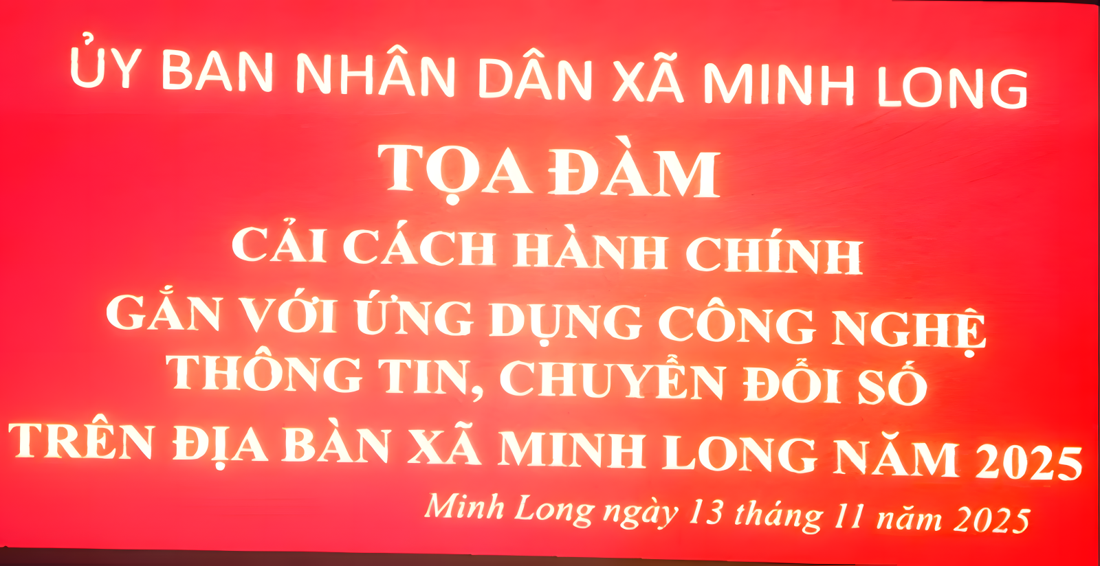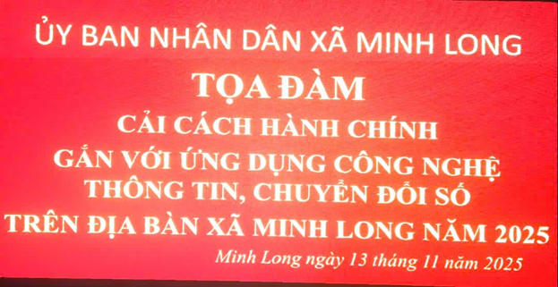Sáng ngày 13/11/2025, Ủy ban nhân dân xã Minh Long tổ chức Tọa đàm “Cải cách hành chính gắn với ứng dụng công nghệ thông tin, chuyển đổi số trên địa bàn xã Minh Long năm 2025”. Tham dự buổi tọa đàm có Đại diện lãnh đạo các cơ quan, đơn vị thuộc xã. Đại diện lãnh đạo một số trường TH và THCS trên địa bàn. Đại diện các doanh nghiệp Viễn thông trên địa bàn xã.